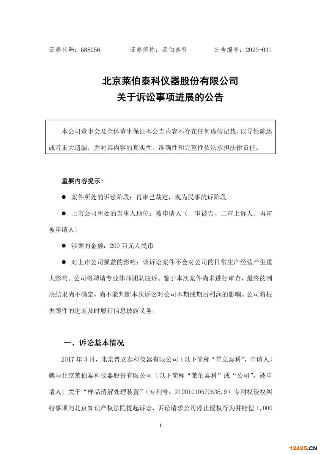 10月9日,北京萊伯泰科儀器股份有限公司(下稱萊伯泰科)發(fā)布關(guān)于公司訴訟事項(xiàng)進(jìn)展的公告。公告顯示,萊伯泰科與北京普立泰科儀器有限公司(下稱普立泰科)專利糾紛一案進(jìn)行到民事抗訴階段,目前最高人民檢察院已受理此案。