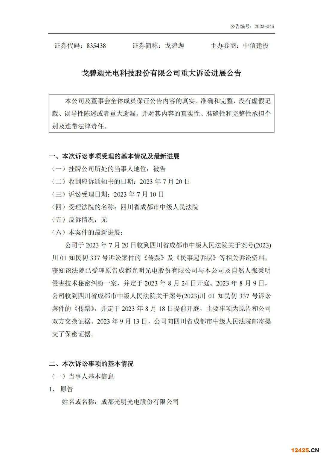 9月26日,湖北戈碧迦光電科技股份有限公司(下稱戈碧迦光電)發(fā)布了關(guān)于重大訴訟進(jìn)展的公告。公告顯示,成都光明光電股份有限公司(下稱光明光電)以侵害技術(shù)秘密為由,在四川省成都市中級(jí)人民法院對(duì)戈碧迦光電提起訴訟。