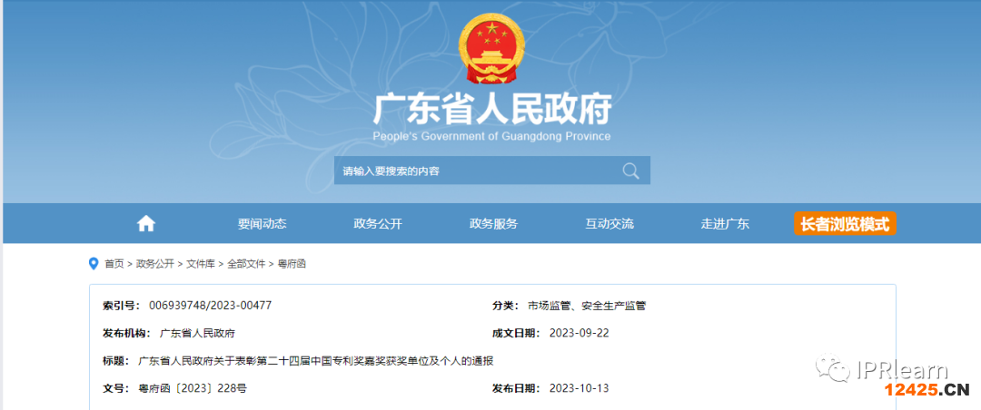 廣東省政府表彰第二十四屆中國專利獎嘉獎獲獎單位及個(gè)人的通報(bào)