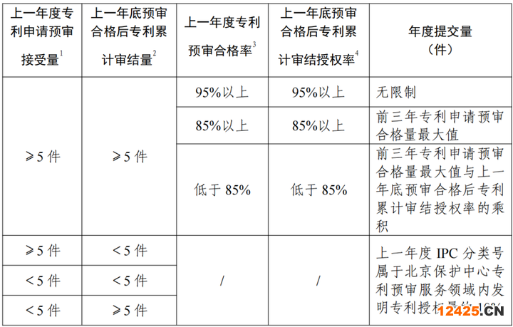 2.對于上一年度預(yù)審合格率和上一年底預(yù)審合格后專利累計(jì)審結(jié)授權(quán)率均為85%以上的備案主體,本年度提交量設(shè)置為前三年專利申請預(yù)審合格量的最大值。