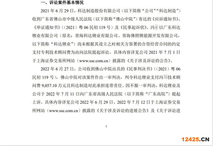 2021年6月29日,科達制造收到廣東省佛山市中級人民法院寄達的《應訴通知書》、《舉證通知書》((2021)粵 06 民初 119號)及《民事起訴狀》。馮某以青??七_鋰業(yè)有限公司(原名:青海佛照鋰能源開發(fā)有限公司,下稱“青海科達鋰業(yè)”)尚未根據(jù)其設立之時相關方簽署的合資經(jīng)營合同的約定支付專利技術顧問費為由向法院提起訴訟。