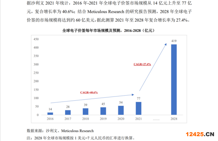 近年來,“新零售”逐漸走向成熟,隨著電子價(jià)簽的技術(shù)與應(yīng)用價(jià)值不斷豐富,電子價(jià)簽成為推進(jìn)門店數(shù)字化的重要一環(huán)。據(jù)沙利文統(tǒng)計(jì)及Meticulous Research 的研究報(bào)告預(yù)測,近年來全球電子價(jià)簽每年市場規(guī)模不斷擴(kuò)大,2021年至2028 年復(fù)合增長率達(dá)27.4%。