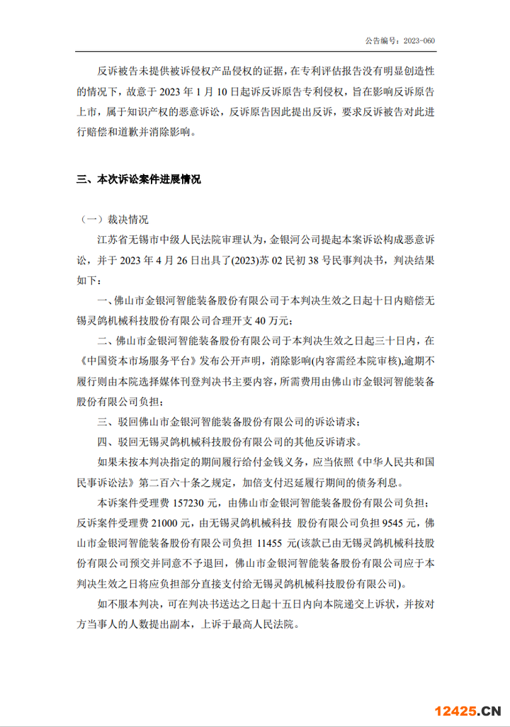 4月26日,無錫中院對這起反訴作出一審判決,法院經(jīng)審理認(rèn)為金銀河公司提起的專利侵權(quán)訴訟構(gòu)成惡意訴訟,判令金銀河公司向靈鴿科技賠償合理開支40萬,并在《中國資本市場服務(wù)平臺》發(fā)布公開聲明消除影響,駁回金銀河公司的訴訟請求,駁回靈鴿科技其他反訴請求。