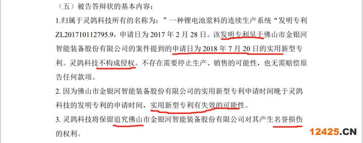 靈鴿科技則在答辯狀中自證清白,稱靈鴿科技的ZL201710112795.9號(名稱:一種鋰電池漿料的連續(xù)生產(chǎn)系統(tǒng))發(fā)明專利申請于2017年2月,早于金銀河公司2018年7月申請的ZL201821155731.3專利,因此靈鴿科技不構(gòu)成侵權(quán),且金銀河公司實用新型專利有失效的可能。