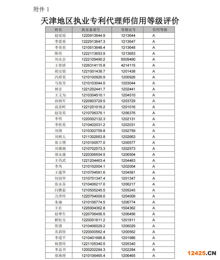 附件1.天津地區(qū)執(zhí)業(yè)專利代理師信用等級評價(jià)