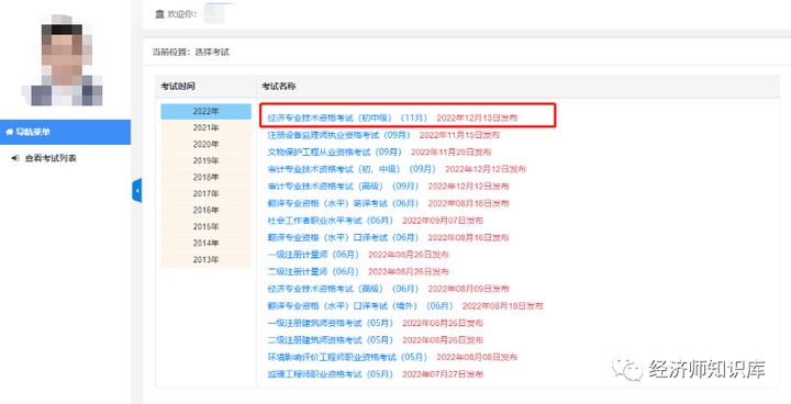 ④授權(quán)登錄后,選擇“考試年度”和“經(jīng)濟(jì)專(zhuān)業(yè)技術(shù)資格考試(初中級(jí))”即可。