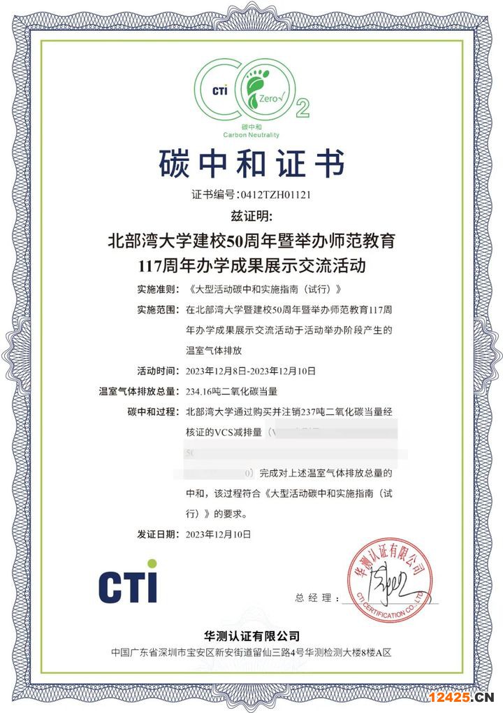 2023年12月8-10日,北部灣大學(xué)舉辦建校50周年暨師范教育117周年華誕活動(dòng),華測認(rèn)證有限公司(以下簡稱“CTI華測認(rèn)證”)為北部灣大學(xué)此次活動(dòng)頒發(fā)了PAS 2060碳中和認(rèn)證證書(編號0412TZH01121)。這一認(rèn)證標(biāo)志著北部灣大學(xué)成為國內(nèi)首個(gè)獲得 “碳中和”認(rèn)證校慶大會(huì)的高校,為校園環(huán)境保護(hù)和全球氣候變化應(yīng)對貢獻(xiàn)了力量。