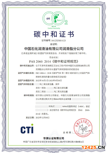 CTI華測認(rèn)證為中石化潤滑脂公司頒發(fā)碳中和證書