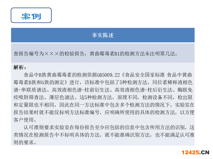認(rèn)可準(zhǔn)則要求實驗室在報告結(jié)果時應(yīng)包括客戶同意的、解釋結(jié)果所必需的以及所用方法要求的全部信息。當(dāng)方法標(biāo)準(zhǔn)對報告結(jié)果有要求時,實驗室應(yīng)滿足方法標(biāo)準(zhǔn)的要求。以上案例均是方法標(biāo)準(zhǔn)有要求,而實驗室在報告結(jié)果時沒有滿足方法標(biāo)準(zhǔn)的要求。例如案例1.GB/T22048-2015標(biāo)準(zhǔn)中,12 測試報告至少應(yīng)包括以下內(nèi)容:c)提取方法(方法A或方法B);d)定量方法(外標(biāo)法或內(nèi)標(biāo)法),案例中的實驗室在出具檢測報告時,忽視了標(biāo)準(zhǔn)的要求。