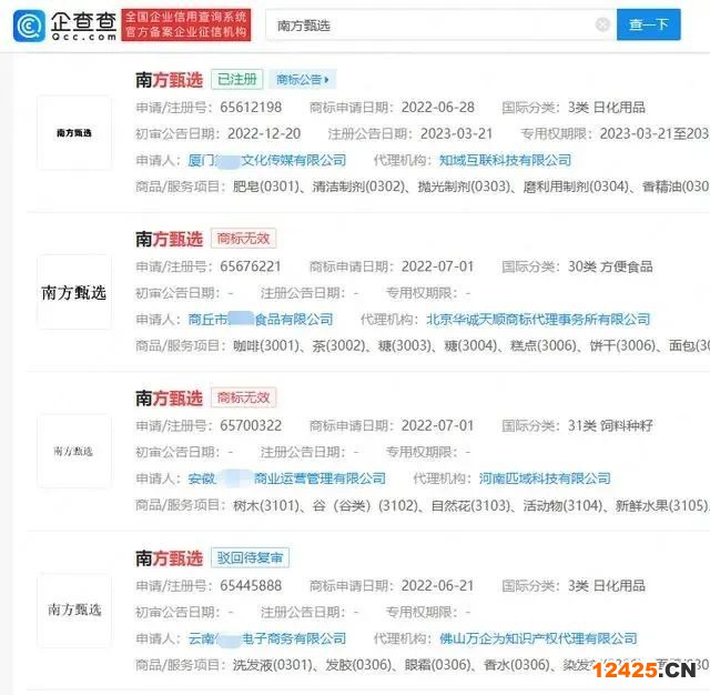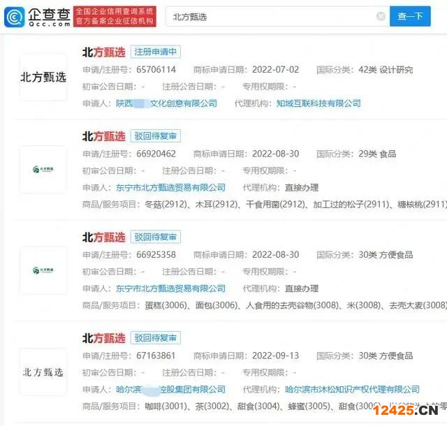 此外,“西方甄選”“南方甄選”“北方甄選”商標(biāo)也被多家公司申請注冊,國際分類涉及方便食品、餐飲住宿、廣告銷售等,其中杭州某公司申請的“西方甄選”和廈門某公司申請的商標(biāo)“南方甄選”部分已注冊成功,其他商標(biāo)申請多被駁回或無效狀態(tài)。