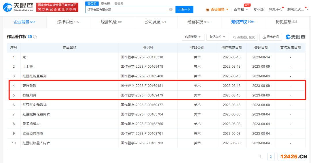 天眼查App顯示,今年8月,紅豆集團有限公司“龍行龘龘”作品著作權(quán)獲批登記,此外其還登記了“有龍則靈”作品著作權(quán)。