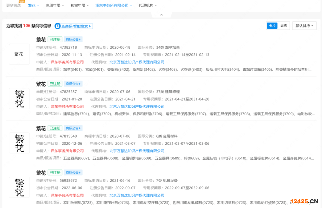 在澤東事務所有限公司申請的商標中,也有申請被駁回,例如“三羊”在2020年8月被申請,但申請結果顯示,不予受理,該商標已失效。“汪小姐”“不響”“繁花”等已成功注冊商標。“爺叔”則早在2012年、2017年就被申請注冊為商標,申請人分別是上海祖香食品有限公司、上海磊甲商貿有限公司。“寶總”從2018年開始被注冊為商標,申請人為個人,商標商品服務涉及醫(yī)療器械和儀器、茶飲料等。