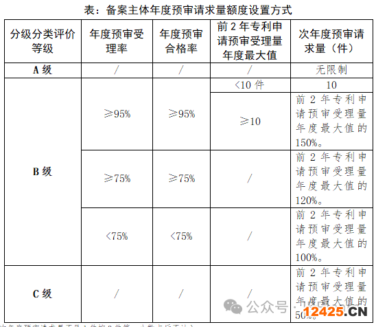 3.分級(jí)分類(lèi)等級(jí)評(píng)定為C級(jí)的備案主體,次年度預(yù)審服務(wù)請(qǐng)求量額度設(shè)置為前2年專(zhuān)利申請(qǐng)預(yù)審受理量年度最大值的50%。