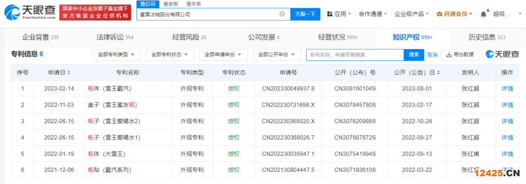 天眼查App顯示,蜜雪冰城股份有限公司曾申請(qǐng)多個(gè)瓶子、瓶貼、箱子等瓶裝飲料相關(guān)外觀專利,涉及“雪王愛喝水”“大雪王”“雪王霸汽”等產(chǎn)品,當(dāng)前專利狀態(tài)均為已獲授權(quán)。