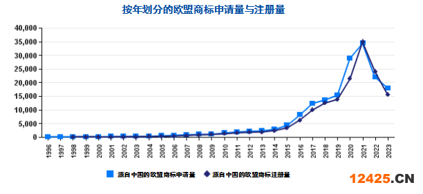 中國(guó)申請(qǐng)人提交的歐盟商標(biāo)申請(qǐng)量達(dá)到174.265件(截至2023年11月),占所有歐盟商標(biāo)申請(qǐng)的6.22%,這使得中國(guó)成為全球歐盟商標(biāo)申請(qǐng)量排名第六的國(guó)家。但是,如果單參考2023年的申請(qǐng)情況,中國(guó)是歐盟商標(biāo)申請(qǐng)量最多的國(guó)家。