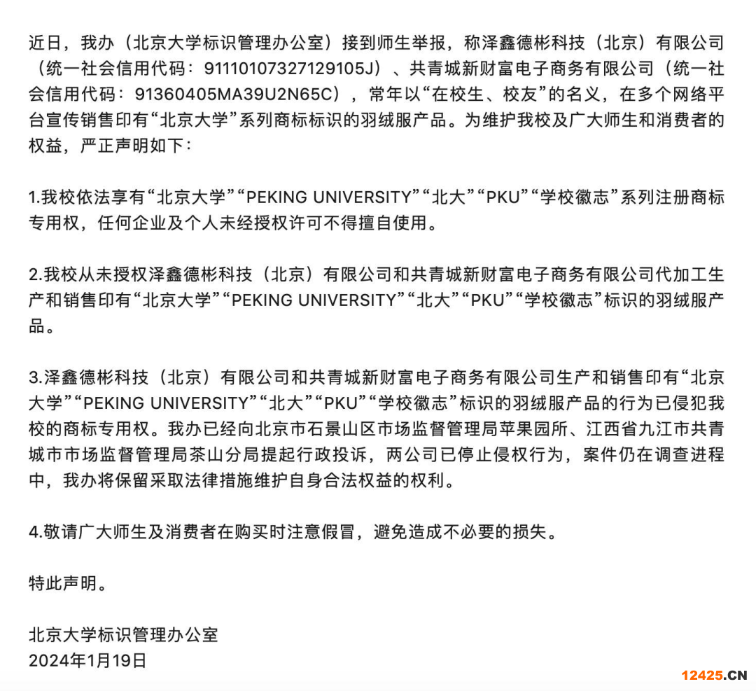 商標標識被冒用于羽絨服?北京大學(xué)嚴正聲明