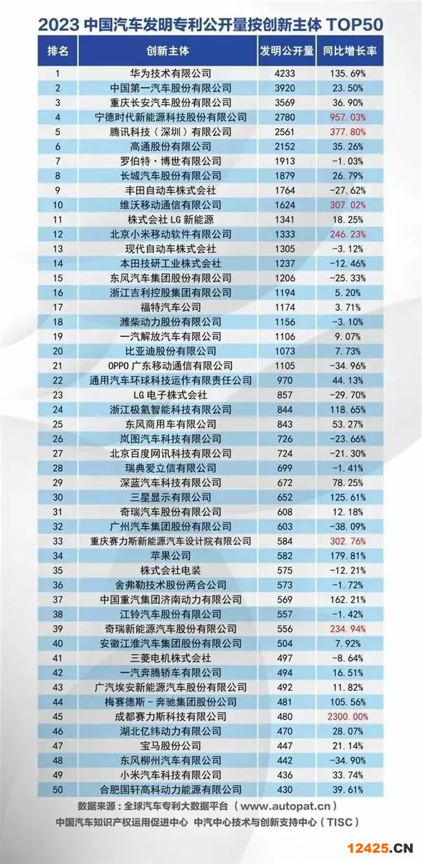 2023年中國汽車發(fā)明專利公開量按創(chuàng)新主體統(tǒng)計(jì)TOP50中,華為以4233件,135.69%的同比增長率位居第一,寧德時(shí)代、騰訊、維沃、賽力斯、奇瑞新能源等企業(yè)發(fā)明專利公開量增速明顯。