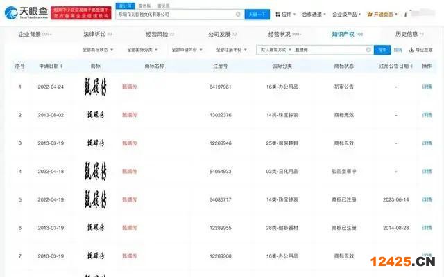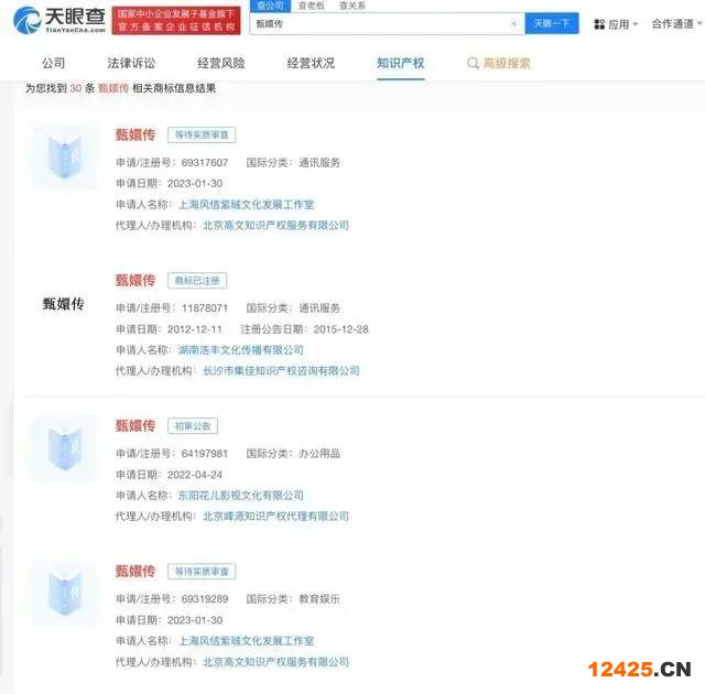 天眼查App顯示,東陽花兒影視文化有限公司已成功注冊多枚“甄嬛傳”商標(biāo),國際分類包括健身器材、珠寶鐘表等。此外,“甄嬛傳”還被多方搶注商標(biāo),其中多數(shù)已被駁回。