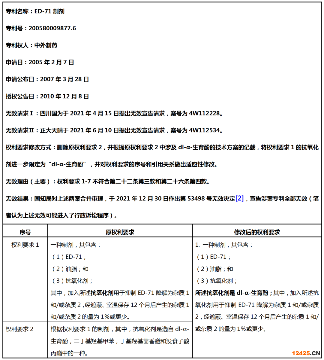 在無效宣告程序中,其中一個無效理由為權(quán)利要求1-7不符合《專利法》第二十六條第四款,中外制藥為了規(guī)避該無效理由,對權(quán)利要求進行了修改,即刪除原權(quán)利要求2.并根據(jù)原權(quán)利要求2中涉及dl-α-生育酚的技術(shù)方案的記載,將權(quán)利要求1的抗氧化劑進一步限定為“dl-α-生育酚”,并對權(quán)利要求的序號和引用關(guān)系做出適應(yīng)性修改。具體信息參見下表1.關(guān)于涉案專利不符合專利法第二十六條第四款以及第二十二條第三款的詳細(xì)內(nèi)容可參見《中國藥品專利鏈接訴訟第一案所涉專利無效對專利申請的啟示》。