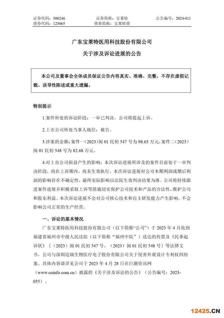 2024年2月8日,廣東寶萊特醫(yī)用科技股份有限公司 (以下簡稱“寶萊特”)發(fā)布關(guān)于涉及訴訟進展的公告。公告顯示,其與深圳邁瑞生物醫(yī)療電子股份有限公司(以下簡稱“邁瑞生物”)的兩起專利訴訟一審判決結(jié)果出爐,判賠金額合計176萬元。