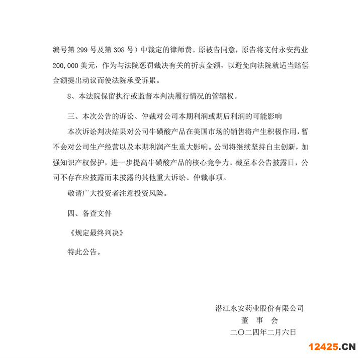 2023年6月,永安藥業(yè)收到美國法院法官批準(zhǔn)的《關(guān)于不侵犯10040755號(hào)和10961183號(hào)美國專利的規(guī)定和裁定》文件,法院作出永安藥業(yè)用于制造?;撬岬墓に嚊]有侵犯針對(duì)10040755號(hào)和10961183號(hào)專利所提出的指控等7項(xiàng)裁定。