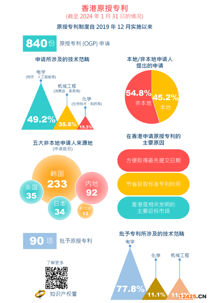 原授專利制度實(shí)施剛滿四周年。截至2024年1月31日,知識(shí)產(chǎn)權(quán)署轄下專利注冊(cè)處共收到840份涉及不同科技領(lǐng)域的原授標(biāo)準(zhǔn)專利申請(qǐng),并已批予90項(xiàng)原授標(biāo)準(zhǔn)專利。當(dāng)中,四成多的原授標(biāo)準(zhǔn)專利申請(qǐng)來(lái)自香港特區(qū)申請(qǐng)人,五成半來(lái)自其他地區(qū)的申請(qǐng)人,其中申請(qǐng)人來(lái)源地主要包括韓國(guó)、中國(guó)內(nèi)地、日本、美國(guó)及新加坡。