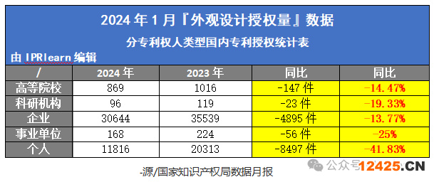 根據(jù)國知局公布的月報(bào)(分專利權(quán)人類型國內(nèi)專利授權(quán)統(tǒng)計(jì)表)2024年1月外觀設(shè)計(jì)授權(quán)量與去年同比全面下降: