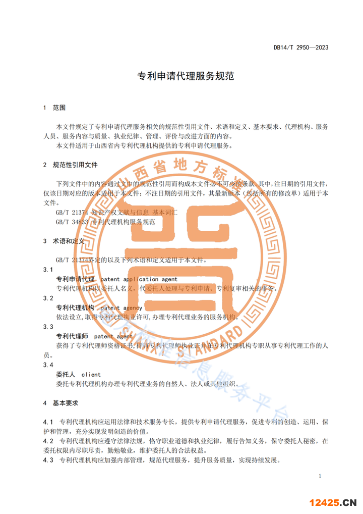 近日,地方標(biāo)準(zhǔn)信息服務(wù)平臺(tái)發(fā)布了《專利申請(qǐng)代理服務(wù)規(guī)范》山西標(biāo)準(zhǔn),該標(biāo)準(zhǔn)將于2024年3月28日起實(shí)施。全文如下: