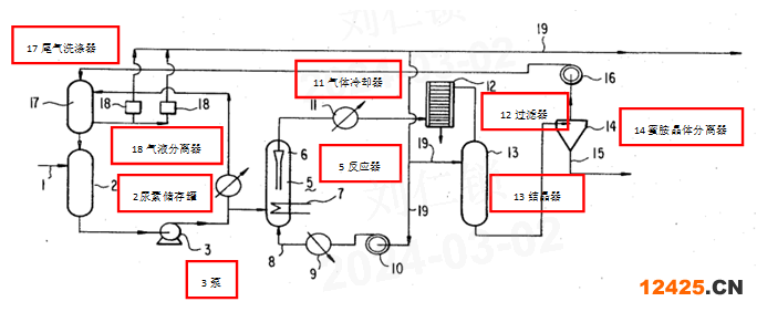 對比說明書附圖圖1和圖2可以看出冷氣鼓風(fēng)機(jī)位置的變化,即圖1中冷氣鼓風(fēng)機(jī)位于尿素洗滌塔與蜜胺捕集器之間,圖2中冷氣鼓風(fēng)機(jī)位于氣液分離器與結(jié)晶器之間。