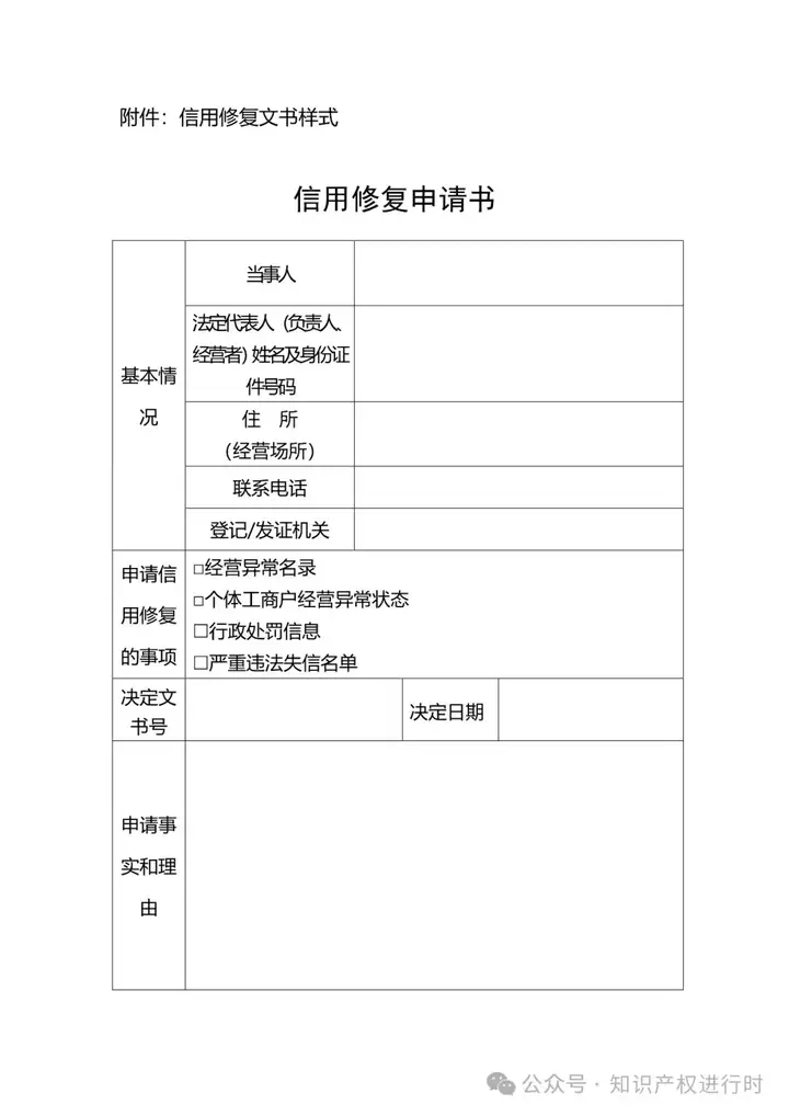 第十六條 本工作指引規(guī)定的信用修復(fù)相關(guān)文書格式參照國家市場監(jiān)管總局統(tǒng)一制定的格式范本,各級知識產(chǎn)權(quán)管理部門結(jié)合實際工作,規(guī)范制作和使用。