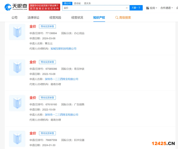 天眼查知識(shí)產(chǎn)權(quán)信息顯示,“金價(jià)”被多方申請(qǐng)注冊(cè)商標(biāo),申請(qǐng)人包括深圳某珠寶公司及多名自然人,其最早申請(qǐng)于2017年,最新申請(qǐng)于今年3月,國(guó)際分類(lèi)包括辦公用品、珠寶鐘表、科學(xué)儀器等。目前,除今年申請(qǐng)的2枚商標(biāo)處于“受理通知書(shū)發(fā)文”狀態(tài)外,其余商標(biāo)申請(qǐng)均已被駁回。