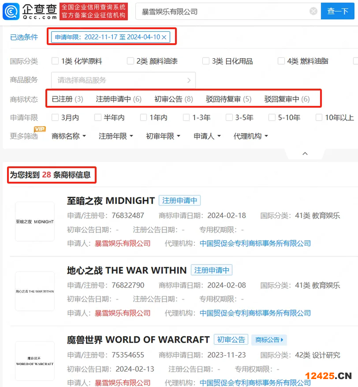 企查查APP顯示,2022年11月17日后,暴雪娛樂有限公司申請(qǐng)注冊(cè)28枚商標(biāo),內(nèi)容涵蓋《魔獸世界》《爐石傳說》等多個(gè)暴雪旗下熱門游戲IP,目前商標(biāo)狀態(tài)多為注冊(cè)申請(qǐng)中。