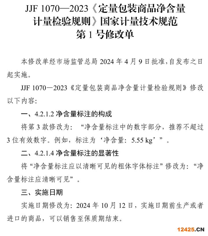 近日,市場監(jiān)管總局批準發(fā)布JJF 1070—2023《定量包裝商品凈含量計量檢驗規(guī)則》國家計量技術規(guī)范第1號修改單,JJF 1070-2023《定量包裝商品凈含量計量檢驗規(guī)則》將于2024年10月12日正式實施。