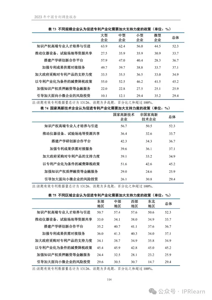 四是推進(jìn)專利產(chǎn)業(yè)化需要更多高端專業(yè)人才支撐。2023 年,55.2%的企業(yè)專利權(quán)人反映缺少高端專業(yè)人才是制約專利產(chǎn)業(yè)化的最大困難和障礙,該比例較上年提高 6.5 個(gè)百分點(diǎn)。52.3%的企業(yè)認(rèn)為需要加大知識產(chǎn)權(quán)高端專業(yè)人才培養(yǎng)與引進(jìn)方面的政策支持,其中,醫(yī)藥制造業(yè)和汽車制造業(yè)企業(yè)這一比例最高,分別為 65.3%和 61.4%。