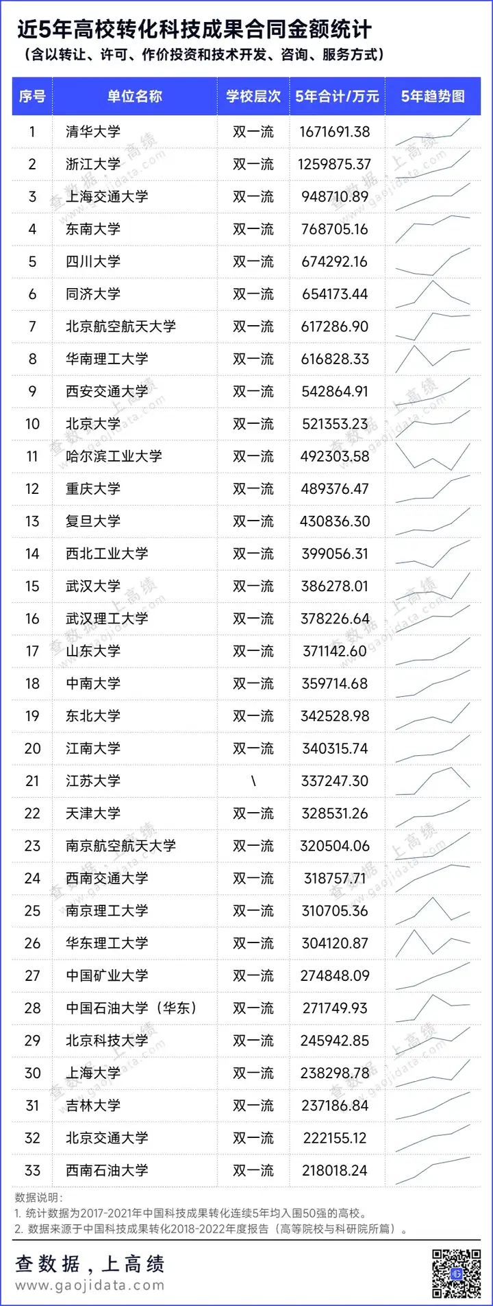 自2017年起,依據(jù)財政部、科技部建立的報告制度,我國高校與科研院所均要報送上一年度的科技成果轉(zhuǎn)化報告,由國家科技評估中心等機構(gòu)統(tǒng)一編纂出版。高績(ID:gjdata)根據(jù)中國科技成果轉(zhuǎn)化2018-2022年度報告(高等院校與科研院所篇),對全國高校2017年-2021年的科技成果轉(zhuǎn)化合同金額進(jìn)行整理統(tǒng)計。