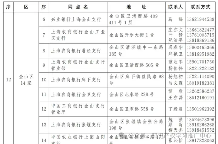 首批“上海市銀行機構(gòu)知識產(chǎn)權(quán)質(zhì)押貸款特色網(wǎng)點”名單