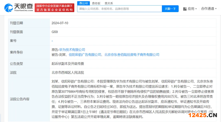 核心提示:華為發(fā)起商標(biāo)維權(quán)索賠50萬天眼查法律訴訟信息顯示,近日,北京市西城區(qū)人民法院向被告劉某、信陽彩韻廣告有限公司公告送達(dá)起訴狀副本及開庭