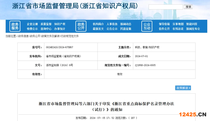 (原標(biāo)題:浙江省市場監(jiān)督管理局等六部門關(guān)于印發(fā)《浙江省重點(diǎn)商標(biāo)保護(hù)名錄管理辦法<試行>》的通知)
