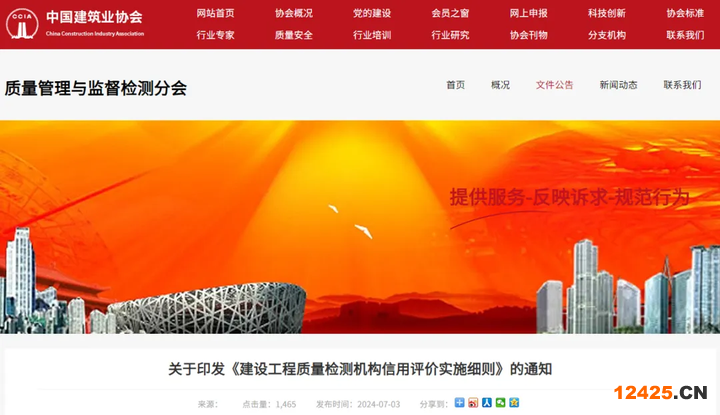 中國建筑業(yè)協(xié)會(huì)質(zhì)量管理與監(jiān)督檢測(cè)分會(huì)負(fù)責(zé)開展檢測(cè)機(jī)構(gòu)AAA級(jí)信用評(píng)價(jià),并將評(píng)價(jià)結(jié)果向中國建筑業(yè)協(xié)會(huì)備案后發(fā)布。