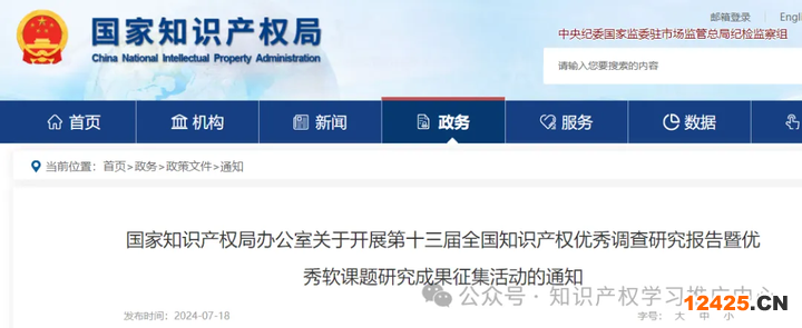 國(guó)知局:第十三屆全國(guó)知識(shí)產(chǎn)權(quán)優(yōu)秀調(diào)查研究報(bào)告暨優(yōu)秀軟課題研究成果征集活動(dòng)的通知