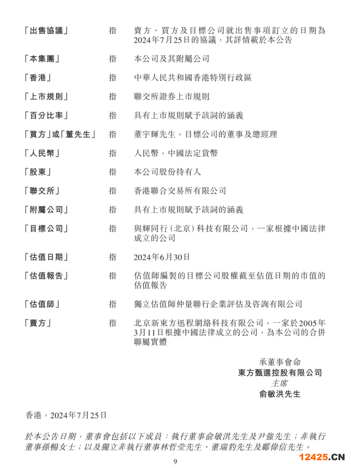 公告顯示,董宇輝、北京新東方迅程網(wǎng)絡(luò)科技有限公司(下稱“新東方集團(tuán)”)和與輝同行(北京)科技有限公司(下稱“與輝同行公司”)訂立出售協(xié)議,東方甄選同意出售與輝同行公司100%股權(quán),代價(jià)為人民幣76.585.460元。