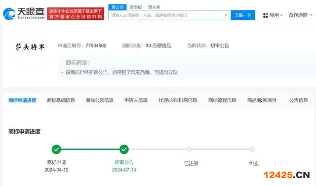 天眼查App顯示,今年4月,有自然人申請注冊“莎頭將軍”商標,國際分類為方便食品,7月13日,該商標狀態(tài)已更新為“初審公告”。