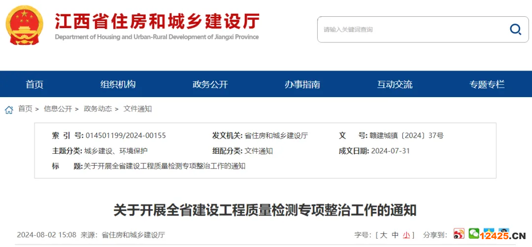為貫徹落實《建設工程質(zhì)量檢測管理辦法》(住建部令第57號)精神和《省質(zhì)量強省領導小組關于印發(fā)<2024年江西省質(zhì)量強省工作要點>的通知》(贛質(zhì)強省〔2024〕1號)要求,結合正在開展的住建領域群眾身邊不正之風和腐敗問題集中整治工作,經(jīng)研究,決定開展全省建設工程質(zhì)量檢測專項整治工作。現(xiàn)將有關事項通知如下: