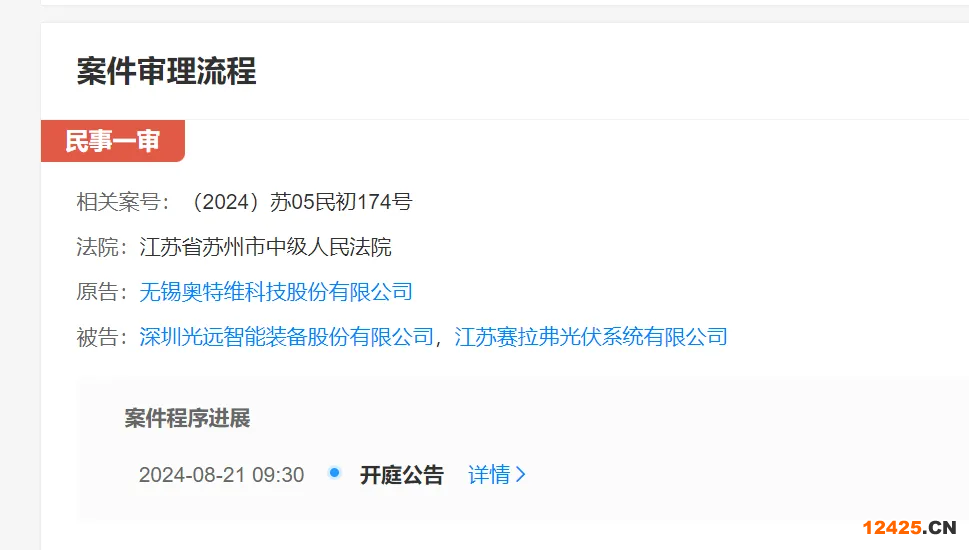 據(jù)悉,無錫奧特維科技股份有限公司與深圳光遠智能裝備股份有限公司、江蘇賽拉弗光伏系統(tǒng)有限公司的相關(guān)案件將于8月21日開庭,審理法院為江蘇省蘇州市中級人民法院,案號為(2024)蘇05民初174號。