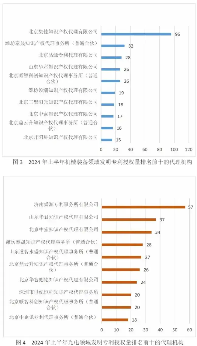 此外,經(jīng)對2024年上半年機械裝備、光電、化工、生物醫(yī)藥四個產(chǎn)業(yè)領域發(fā)明授權(quán)的代理機構(gòu)案件統(tǒng)計分析,發(fā)明專利授權(quán)量排名前十的代理機構(gòu)如圖3-6所示。