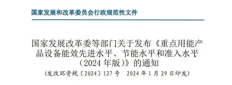 2024年1月,國家發(fā)展改革委等部門發(fā)布了《重點用能產(chǎn)品設(shè)備能效先進水平、節(jié)能水平和準(zhǔn)入水平(2024年版)》,提到“推動相關(guān)企業(yè)實施產(chǎn)品設(shè)備更新改造,鼓勵更新改造后達到能效節(jié)能水平,并力爭達到能效先進水平”。