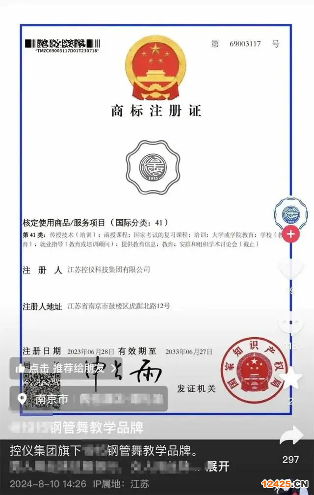 據(jù)了解,該鋼管舞培訓(xùn)機(jī)構(gòu)發(fā)布了一張商標(biāo)注冊證,注冊人為江蘇控儀科技集團(tuán)有限公司(以下簡稱江蘇控儀),注冊日期為2023年6月28日,對應(yīng)配文表示自己是江蘇控儀旗下的鋼管舞教學(xué)品牌。
