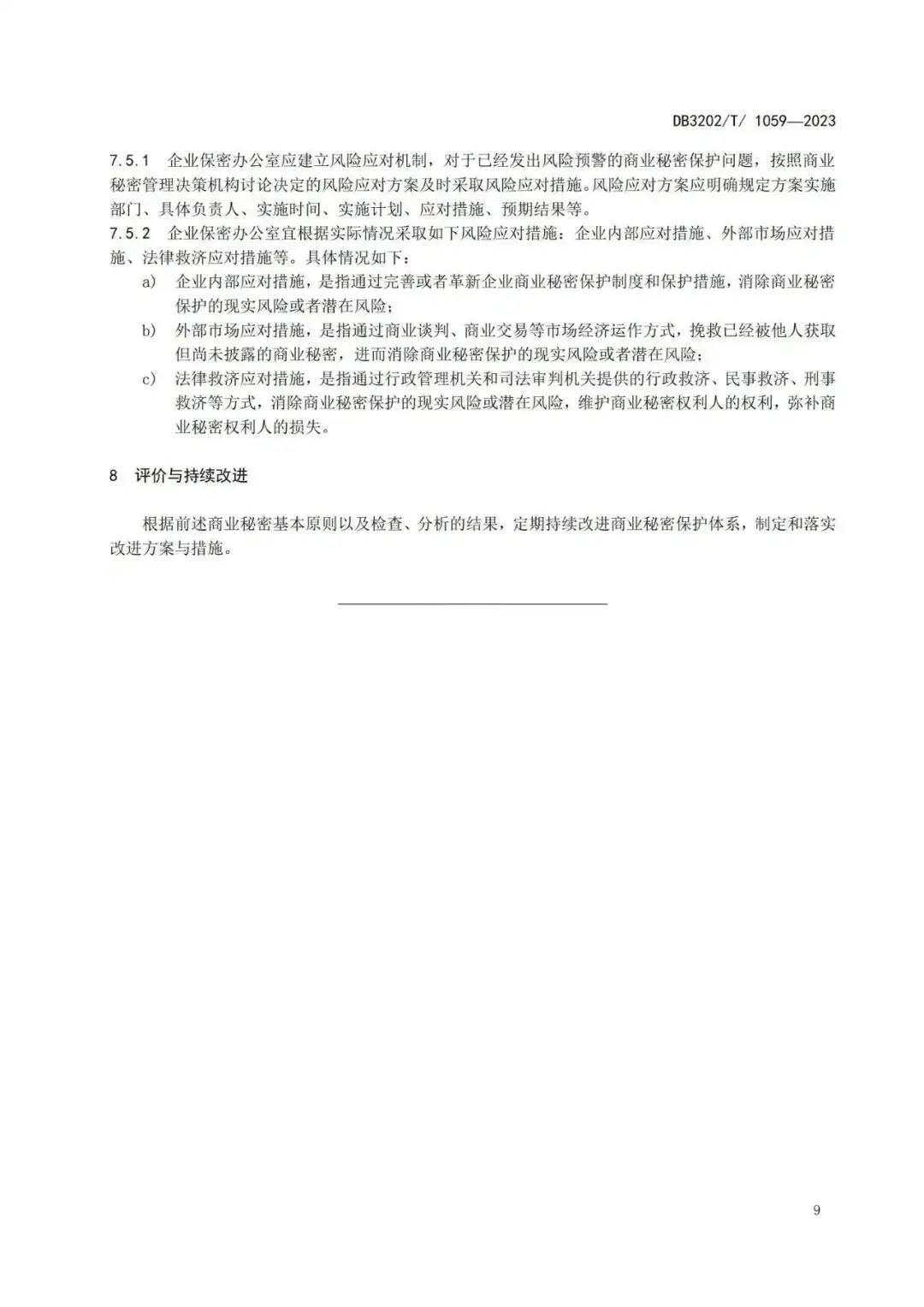 《企業(yè)商業(yè)秘密保護(hù)體系建設(shè)規(guī)范》標(biāo)準(zhǔn)包括術(shù)語(yǔ)和定義、基本原則、管理組織、商業(yè)秘密的管理、風(fēng)險(xiǎn)防范、評(píng)價(jià)與持續(xù)改進(jìn)等內(nèi)容,重點(diǎn)針對(duì)管理組織建設(shè)、商業(yè)秘密范圍界定、密級(jí)期限設(shè)定、物理隔離防護(hù)、知悉范圍管控、秘密流轉(zhuǎn)管理、保密協(xié)議簽訂、競(jìng)業(yè)限制要求等流程規(guī)范,創(chuàng)新性地將風(fēng)險(xiǎn)監(jiān)測(cè)、評(píng)估、預(yù)警與應(yīng)對(duì)作為單獨(dú)章節(jié)予以重點(diǎn)規(guī)范,涵蓋了企業(yè)內(nèi)部商業(yè)秘密保護(hù)體系建設(shè)的全流程。