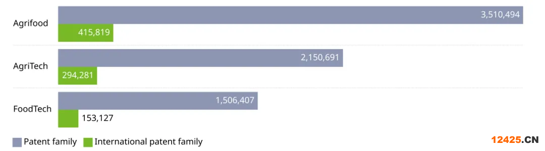 國(guó)際農(nóng)業(yè)食品專利家族(45萬項(xiàng))中,66%屬于農(nóng)業(yè)技術(shù)領(lǐng)域,34%屬于食品技術(shù)領(lǐng)域。近年來,這兩個(gè)行業(yè)都呈現(xiàn)緩慢增長(zhǎng)趨勢(shì),農(nóng)業(yè)技術(shù)和食品技術(shù)的年增長(zhǎng)率分別為6.9%和3.3%。美國(guó)一直以來都是農(nóng)業(yè)食品行業(yè)的主要參與者,但最近中國(guó)和日本的研發(fā)投資出現(xiàn)顯著增長(zhǎng),這預(yù)示著農(nóng)業(yè)食品超級(jí)領(lǐng)域的全球格局可能會(huì)發(fā)生變化。