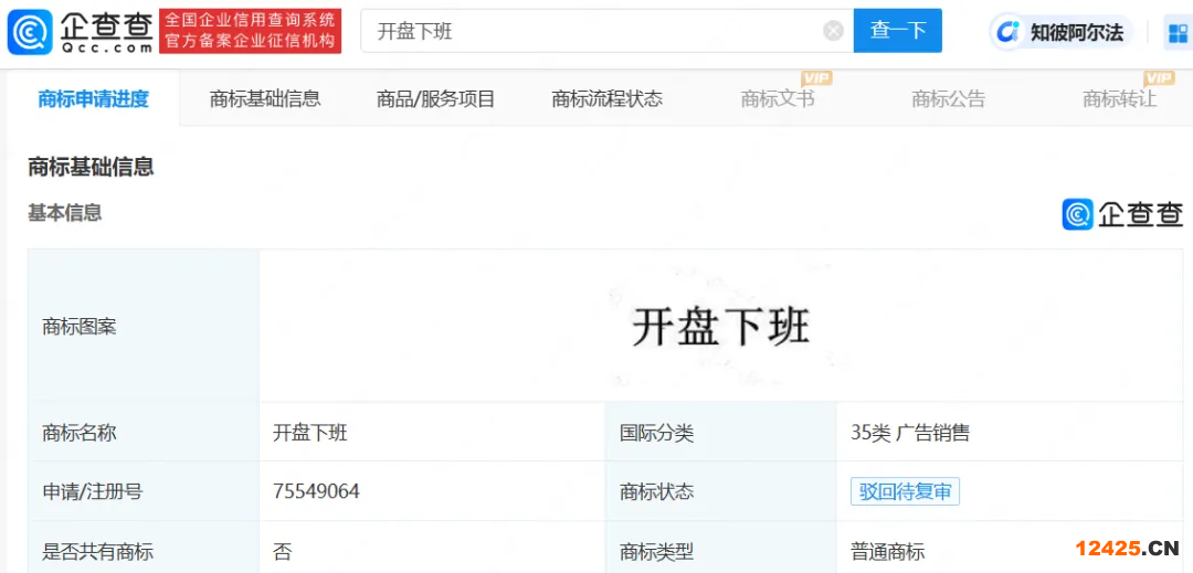 企查查APP顯示,深圳某科技公司曾申請“開盤下班”商標(biāo),申請時間為2023年12月,目前商標(biāo)狀態(tài)為駁回待復(fù)審。